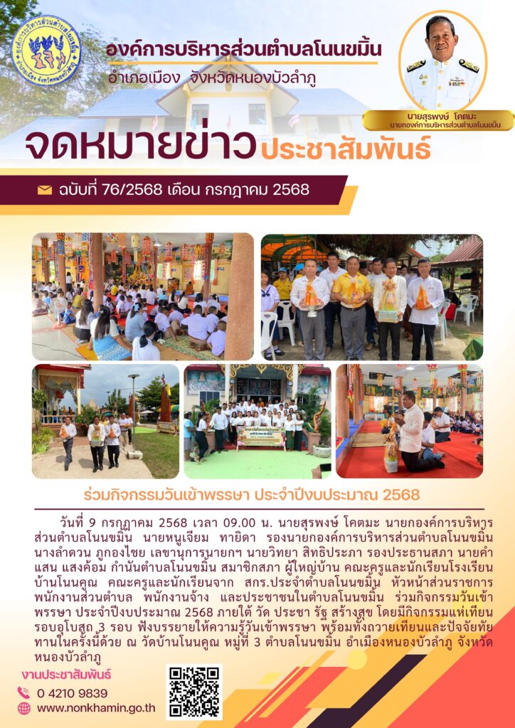 วันที่ 9 กรกฎาคม 2568 เวลา 09.00 น. นายสุรพงษ์ โคตมะ นายกองค์การบริหารส่วนตำบลโนนขมิ้น นายหนูเจียม ทายิดา รองนายกองค์การบริหารส่วนตำบลโนนขมิ้น นางลำดวน ภูกองไชย เลขานุการนายกฯ นายวิทยา สิทธิประภา รองประธานสภา นายคำแสน แสงค้อม กำนันตำบลโนนขมิ้น สมาชิกสภา ผู้ใหญ่บ้าน คณะครูและนักเรียนโรงเรียน บ้านโนนคูณ คณะครูและนักเรียนจาก สกร.ประจำตำบลโนนขมิ้น หัวหน้าส่วนราชการ พนักงานส่วนตำบล พนักงานจ้าง และประชาชนในตำบลโนนขมิ้น ร่วมกิจกรรมวันเข้าพรรษา ประจำปีงบประมาณ 2568 ภายใต้ วัด ประชา รัฐ สร้างสุข โดยมีกิจกรรมแห่เทียนรอบอุโบสถ 3 รอบ ฟังบรรยายให้ความรู้วันเข้าพรรษา พร้อมทั้งถวายเทียนและปัจจัยทัยทานในครั้งนี้ด้วย ณ วัดบ้านโนนคูณ หมู่ที่ 3 ตำบลโนนขมิ้น อำเมืองหนองบัวลำภู จังหวัดหนองบัวลำภู 4 สิงหาคม 2025 admin004 ข่าวประชาสัมพันธ์ทั่วไป 0 FacebookFacebookXXLINELine