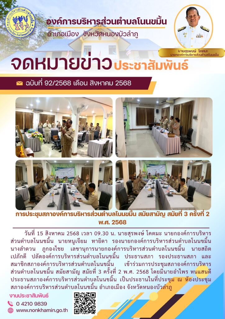 วันที่ 15 สิงหาคม 2568 เวลา 09.30 น. นายสุรพงษ์ โคตมะ นายกองค์การบริหารส่วนตำบลโนนขมิ้น นายหนูเจียม ทายิดา รองนายกองค์การบริหารส่วนตำบลโนนขมิ้น นางลำดวน ภูกองไชย เลขานุการนายกองค์การบริหารส่วนตำบลโนนขมิ้น นายสถิต เปภักดี ปลัดองค์การบริหารส่วนตำบลโนนขมิ้น ประธานสภา รองประธานสภา และสมาชิกสภาองค์การบริหารส่วนตำบลโนนขมิ้น เข้าร่วมการประชุมสภาองค์การบริหารส่วนตำบลโนนขมิ้น สมัยสามัญ สมัยที่ 3 ครั้งที่ 2 พ.ศ. 2568 โดยมีนายอำไพร หนแสนดี ประธานสภาองค์การบริหารส่วนตำบลโนนขมิ้น เป็นประธานในที่ประชุม ณ ห้องประชุมสภาองค์การบริหารส่วนตำบลโนนขมิ้น อำเภอเมือง จังหวัดหนองบัวลำภู 8 ตุลาคม 2025 admin004 ข่าวประชาสัมพันธ์ทั่วไป 0 FacebookFacebookXXLINELine