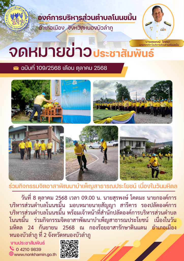 วันที่ 8 ตุลาคม 2568 เวลา 09.00 น. นายสุรพงษ์ โคตมะ นายกองค์การบริหารส่วนตำบลโนนขมิ้น มอบหมายนายสัญญา สารีคาร รองปลัดองค์การบริหารส่วนตำบลโนนขมิ้น พร้อมเจ้าหน้าที่สำนักปลัดองค์การบริหารส่วนตำบลโนนขมิ้น ร่วมกิจกรรมจิตอาสาพัฒนาบำเพ็ญสาธารณประโยชน์ เนื่องในวันมหิดล 24 กันยายน 2568 ณ กองร้อยอาสารักษาดินแดน อำเภอเมืองหนองบัวลำภู ที่ 2 จังหวัดหนองบัวลำภู 21 ตุลาคม 2025 admin004 ข่าวประชาสัมพันธ์ทั่วไป 0 FacebookFacebookXXLINELine