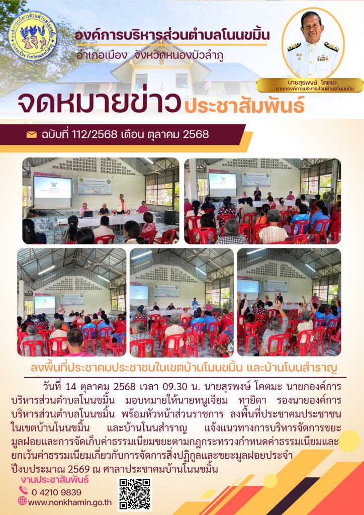 วันที่ 14 ตุลาคม 2568 เวลา 09.30 น. นายสุรพงษ์ โคตมะ นายกองค์การบริหารส่วนตำบลโนนขมิ้น มอบหมายให้นายหนูเจียม ทายิดา รองนายองค์การบริหารส่วนตำบลโนนขมิ้น นายสถิต เปภักดี ปลัดองค์การบริหารส่วนตำบลโนนขมิ้น พร้อมหัวหน้าส่วนราชการ ลงพื้นที่ประชาคมประชาชนในเขตบ้านโนนขมิ้น และบ้านโนนสำราญ แจ้งแนวทางการบริหารจัดการขยะมูลฝอยและการจัดเก็บค่าธรรมเนียมขยะตามกฎกระทรวงกำหนดค่าธรรมเนียมและยกเว้นค่าธรรมเนียมเกี่ยวกับการจัดการสิ่งปฏิกูลและขยะมูลฝอย ประจำปีงบประมาณ 2569 ณ ศาลาประชาคมบ้านโนนขมิ้น ตำบลโนนขมิ้น อำเภอเมืองหนองบัวลำภู จังหวัดหนองบัวลำภู 21 ตุลาคม 2025 admin004 ข่าวประชาสัมพันธ์ทั่วไป 0 FacebookFacebookXXLINELine