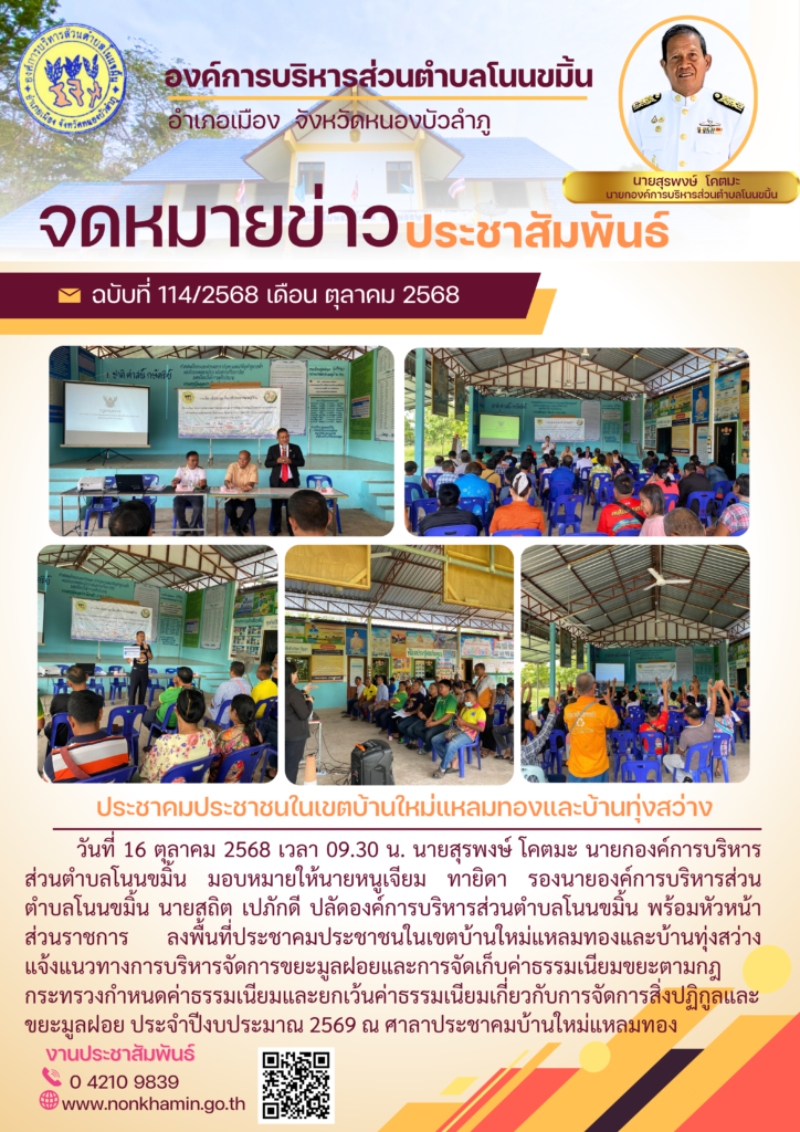 วันที่ 16 ตุลาคม 2568 เวลา 09.30 น. นายสุรพงษ์ โคตมะ นายกองค์การบริหารส่วนตำบลโนนขมิ้น มอบหมายให้นายหนูเจียม ทายิดา รองนายองค์การบริหารส่วนตำบลโนนขมิ้น นายสถิต เปภักดี ปลัดองค์การบริหารส่วนตำบลโนนขมิ้น พร้อมหัวหน้าส่วนราชการ ลงพื้นที่ประชาคมประชาชนในเขตบ้านใหม่แหลมทองและบ้านทุ่งสว่าง แจ้งแนวทางการบริหารจัดการขยะมูลฝอยและการจัดเก็บค่าธรรมเนียมขยะตามกฎกระทรวงกำหนดค่าธรรมเนียมและยกเว้นค่าธรรมเนียมเกี่ยวกับการจัดการสิ่งปฏิกูลและขยะมูลฝอย ประจำปีงบประมาณ 2569 ณ ศาลาประชาคมบ้านใหม่แหลมทอง ตำบลโนนขมิ้น อำเภอเมืองหนองบัวลำภู จังหวัดหนองบัวลำภู 21 ตุลาคม 2025 admin004 ข่าวประชาสัมพันธ์ทั่วไป 0 FacebookFacebookXXLINELine