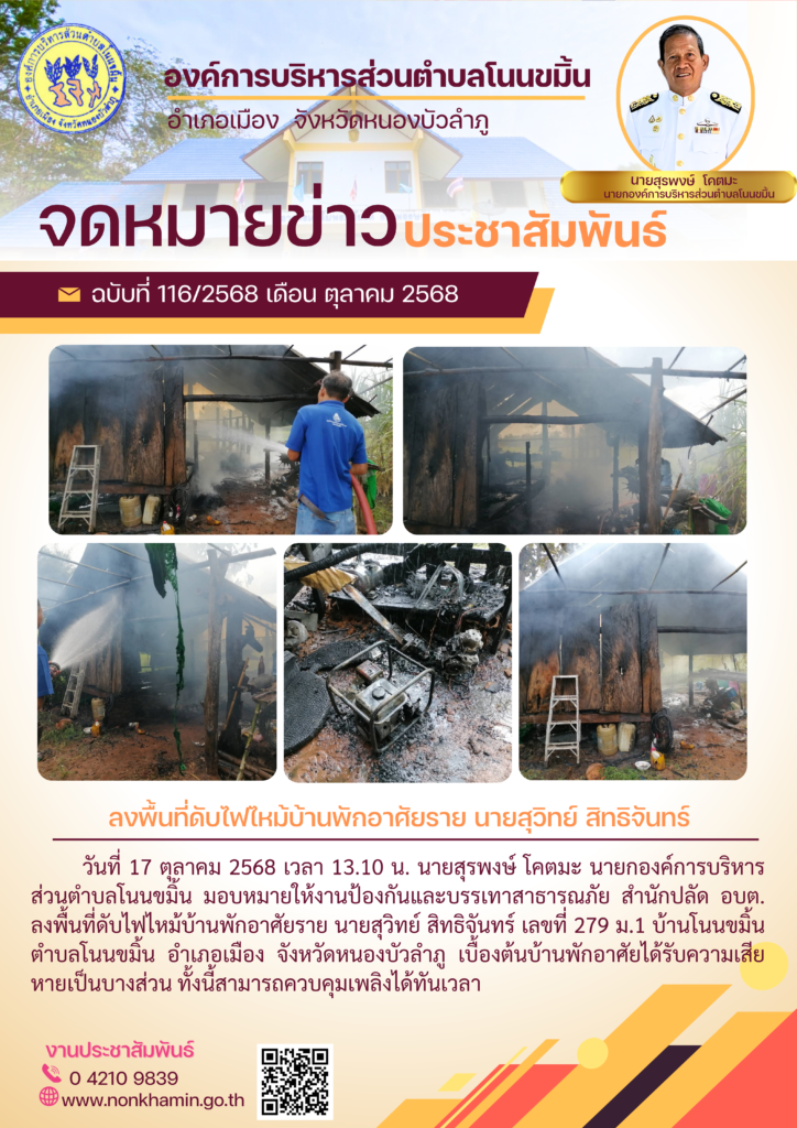 วันที่ 17 ตุลาคม 2568 เวลา 13.10 น. นายสุรพงษ์ โคตมะ นายกองค์การบริหารส่วนตำบลโนนขมิ้น มอบหมายให้งานป้องกันและบรรเทาสาธารณภัย สำนักปลัด อบต. ลงพื้นที่ดับไฟไหม้บ้านพักอาศัยราย นายสุวิทย์ สิทธิจันทร์ เลขที่ 279 ม.1 บ้านโนนขมิ้น ตำบลโนนขมิ้น อำเภอเมือง จังหวัดหนองบัวลำภู เบื้องต้นบ้านพักอาศัยได้รับความเสียหายเป็นบางส่วน ทั้งนี้สามารถควบคุมเพลิงได้ทันเวลา 21 ตุลาคม 2025 admin004 ข่าวประชาสัมพันธ์ทั่วไป 0 FacebookFacebookXXLINELine