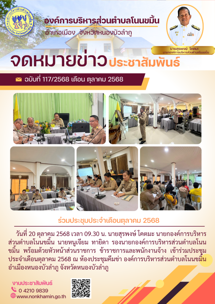 วันที่ 20 ตุลาคม 2568 เวลา 09.30 น. นายสุรพงษ์ โคตมะ นายกองค์การบริหารส่วนตำบลโนนขมิ้น นายหนูเจียม ทายิดา รองนายกองค์การบริหารส่วนตำบลโนนขมิ้น พร้อมด้วยหัวหน้าส่วนราชการ ข้าราชการและพนักงานจ้าง เข้าร่วมประชุมประจำเดือนตุลาคม 2568 ณ ห้องประชุมคึมข่า องค์การบริหารส่วนตำบลโนนขมิ้น อำเมืองหนองบัวลำภู จังหวัดหนองบัวลำภู 21 ตุลาคม 2025 admin004 ข่าวประชาสัมพันธ์ทั่วไป 0 FacebookFacebookXXLINELine