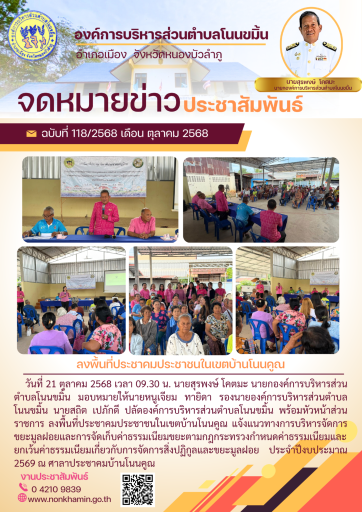 วันที่ 21 ตุลาคม 2568 เวลา 09.30 น. นายสุรพงษ์ โคตมะ นายกองค์การบริหารส่วนตำบลโนนขมิ้น มอบหมายให้นายหนูเจียม ทายิดา รองนายองค์การบริหารส่วนตำบลโนนขมิ้น นายสถิต เปภักดี ปลัดองค์การบริหารส่วนตำบลโนนขมิ้น พร้อมหัวหน้าส่วนราชการ ลงพื้นที่ประชาคมประชาชนในเขตบ้านโนนคูณ แจ้งแนวทางการบริหารจัดการขยะมูลฝอยและการจัดเก็บค่าธรรมเนียมขยะตามกฎกระทรวงกำหนดค่าธรรมเนียมและยกเว้นค่าธรรมเนียมเกี่ยวกับการจัดการสิ่งปฏิกูลและขยะมูลฝอย ประจำปีงบประมาณ 2569 ณ ศาลาประชาคมบ้านโนนคูณ ตำบลโนนขมิ้น อำเภอเมืองหนองบัวลำภู จังหวัดหนองบัวลำภู 21 ตุลาคม 2025 admin004 ข่าวประชาสัมพันธ์ทั่วไป 0 FacebookFacebookXXLINELine