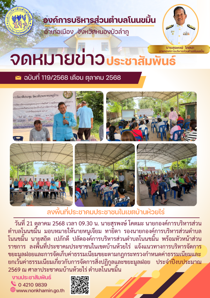 วันที่ 21 ตุลาคม 2568 เวลา 09.30 น. นายสุรพงษ์ โคตมะ นายกองค์การบริหารส่วนตำบลโนนขมิ้น มอบหมายให้นายหนูเจียม ทายิดา รองนายกองค์การบริหารส่วนตำบลโนนขมิ้น นายสถิต เปภักดี ปลัดองค์การบริหารส่วนตำบลโนนขมิ้น พร้อมหัวหน้าส่วนราชการ ลงพื้นที่ประชาคมประชาชนในเขตบ้านห้วยไร่ แจ้งแนวทางการบริหารจัดการขยะมูลฝอยและการจัดเก็บค่าธรรมเนียมขยะตามกฎกระทรวงกำหนดค่าธรรมเนียมและยกเว้นค่าธรรมเนียมเกี่ยวกับการจัดการสิ่งปฏิกูลและขยะมูลฝอย ประจำปีงบประมาณ 2569 ณ ศาลาประชาคมบ้านห้วยไร่ ตำบลโนนขมิ้น อำเภอเมืองหนองบัวลำภู จังหวัดหนองบัวลำภู 21 ตุลาคม 2025 admin004 ข่าวประชาสัมพันธ์ทั่วไป 0 FacebookFacebookXXLINELine
