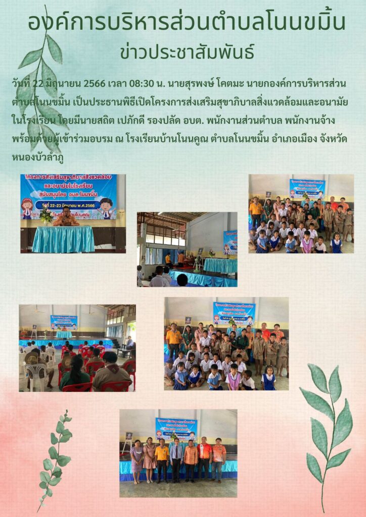 วันที่ 22 มิถุนายน 2566 เวลา 08:30 น. นายสุรพงษ์ โคตมะ นายกองค์การบริหารส่วนตำบลโนนขมิ้น เป็นประธานพิธีเปิดโครงการส่งเสริมสุขาภิบาลสิ่งแวดล้อมและอนามัยในโรงเรียน โดยมีนายสถิต เปภักดี รองปลัด อบต. พนักงานส่วนตำบล พนักงานจ้าง พร้อมด้วยผู้เข้าร่วมอบรม ณ โรงเรียนบ้านโนนคูณ ตำบลโนนขมิ้น อำเภอเมือง จังหวัดหนองบัวลำภู 22 มิถุนายน 2023 admin004 ข่าวประชาสัมพันธ์ทั่วไป 0 FacebookFacebookXXLINELine