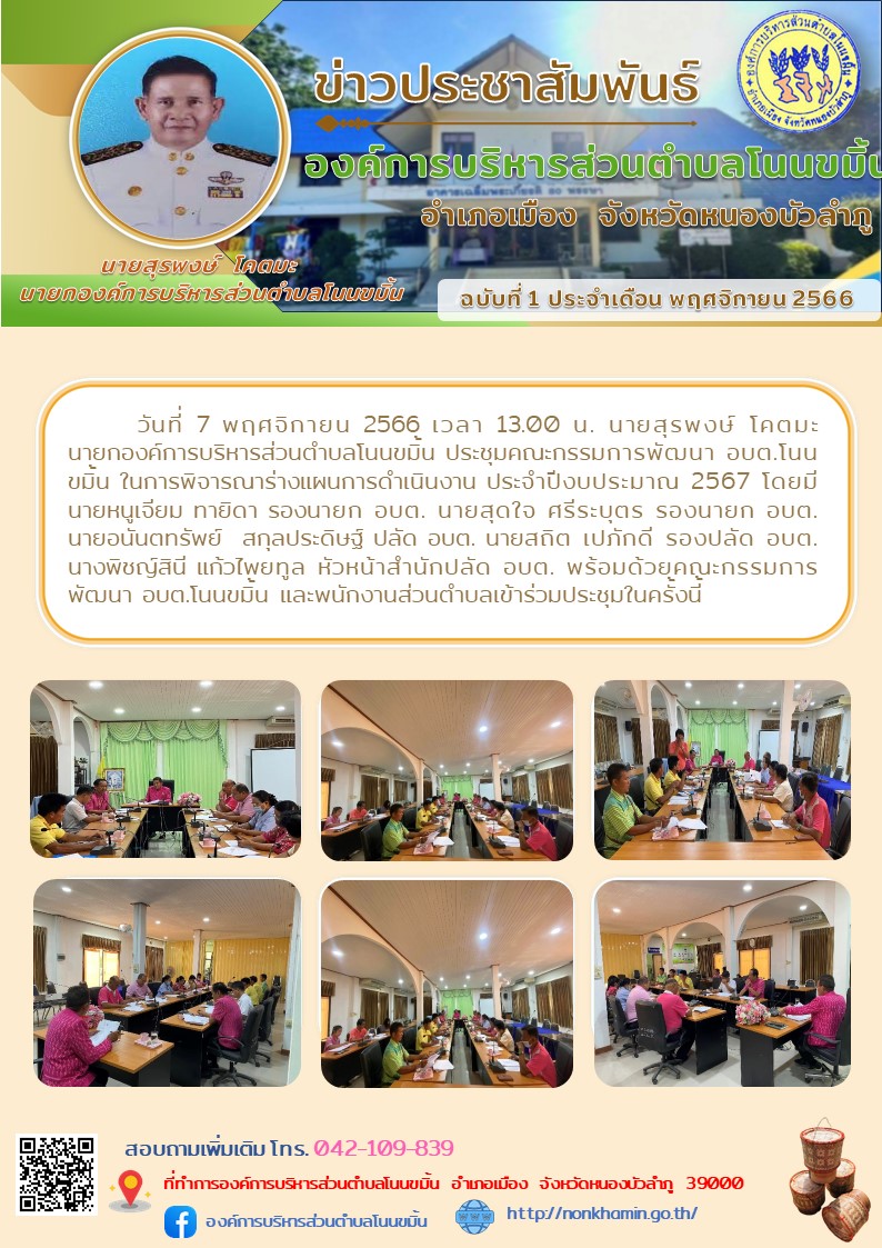 วันที่ 8 พฤศจิกายน 2566 เวลา 09.00 น. นายสุรพงษ์ โคตมะ นายกองค์การบริหารส่วนตำบลโนนขมิ้น มอบหมายให้นายหนูเจียม ทายิดา รองนายกองค์การบริหารส่วนตำบลโนนขมิ้น เข้าร่วมประชุมคณะกรรมการจัดงานพิธีถวายผ้ากฐินสามัคคี จังหวัดหนองบัวลำภู ประจำ พ.ศ.2566 ชุดคณะกรรมการฝ่ายจัดสถานที่ ณ หอประชุมอำเภอเมืองหนองบัวลำภู ที่ว่าอำเภอเมืองหนองบัวลำภู อำเภอเมืองหนองบัวลำภู จังหวัดหนองบัวลำภู 30 พฤศจิกายน 2023 admin004 ข่าวประชาสัมพันธ์ทั่วไป 0 พิจารณาร่างแผนการดำเนินงาน-ประจำปีงบประมาณ-2567-ฉบับที่-1ดาวน์โหลด FacebookFacebookXXLINELine