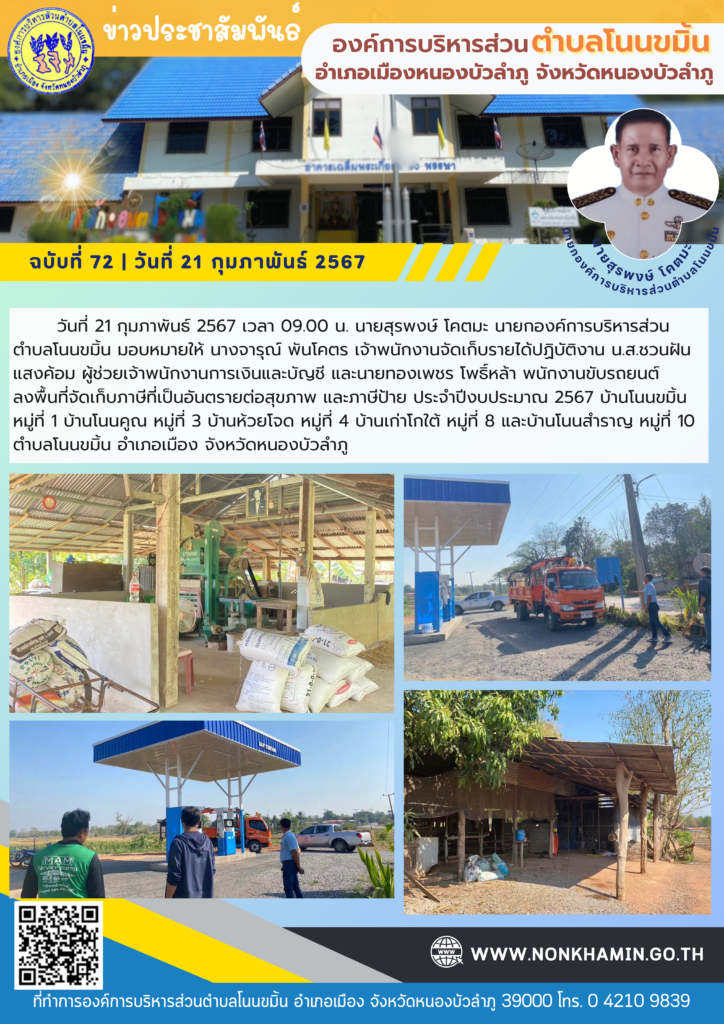 วันที่ 21 กุมภาพันธ์ 2567 เวลา 09.00 น. นายสุรพงษ์ โคตมะ นายกองค์การบริหารส่วนตำบลโนนขมิ้น มอบหมายให้ นางจารุณ์ พันโคตร เจ้าพนักงานจัดเก็บรายได้ปฏิบัติงาน นางสาวชวนฝัน แสงค้อม ผู้ช่วยเจ้าพนักงานการเงินและบัญชี และนายทองเพชร โพธิ์หล้า พนักงานขับรถยนต์ ลงพื้นที่จัดเก็บภาษีที่เป็นอันตรายต่อสุขภาพ และภาษีป้าย ประจำปีงบประมาณ 2567 บ้านโนนขมิ้น หมู่ที่ 1 บ้านโนนคูณ หมู่ที่ 3 บ้านห้วยโจด หมู่ที่ 4 บ้านเก่าโกใต้ หมู่ที่ 8 และบ้านโนนสำราญ หมู่ที่ 10 ตำบลโนนขมิ้น อำเภอเมือง จังหวัดหนองบัวลำภู 27 กุมภาพันธ์ 2024 admin004 ข่าวประชาสัมพันธ์ทั่วไป 0 FacebookFacebookXXLINELine