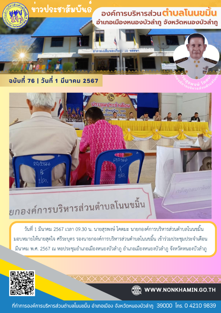วันที่ 1 มีนาคม 2567 เวลา 09.30 น.นายสุรพงษ์ โคตมะ นายกองค์การบริหารส่วนตำบลโนนขมิ้น มอบหมายให้นายสุดใจ ศรีระบุตร รองนายกองค์การบริหารส่วนตำบลโนนขมิ้น เข้าร่วมประชุมประจำเดือนมีนาคม พ.ศ. 2567 ณ หอประชุมอำเภอเมืองหนองบัวลำภู อำเภอเมืองหนองบัวลำภู จังหวัดหนองบัวลำภู 6 มีนาคม 2024 admin004 ข่าวประชาสัมพันธ์ทั่วไป 0 FacebookFacebookXXLINELine